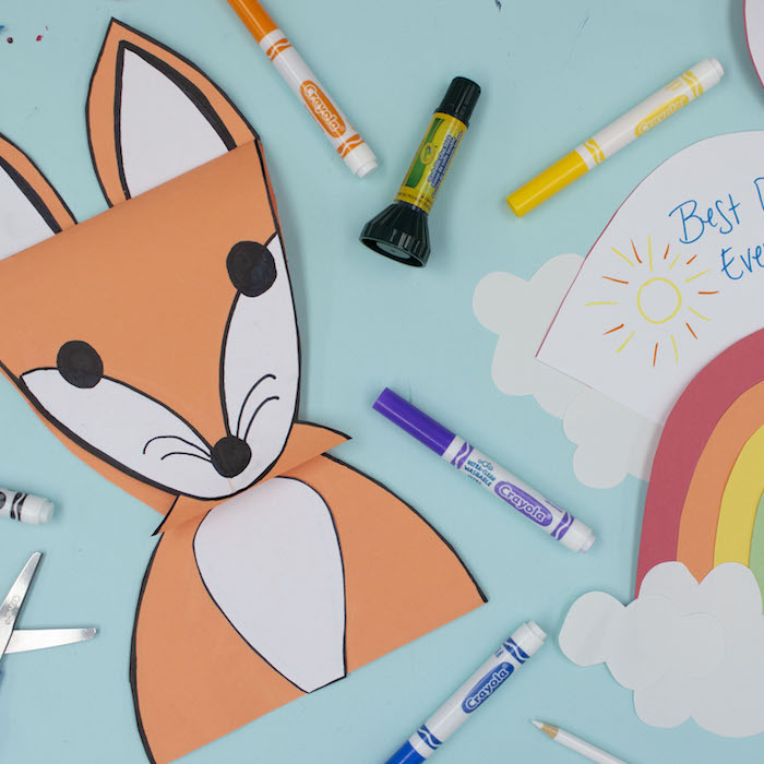 - Cut out the shape of the fox or the rainbow. For the rainbow, you will want to use the main shape of the rainbow to trace and cut the bands of color. Just make sure each band progressively gets smaller. For the Fox make sure to cut the ears, inner earpieces, and the face fur out of white construction paper. You can make your fox and rainbow any color you want.