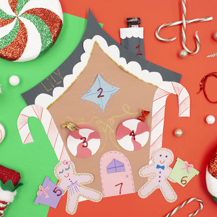 - Use the glitter glue to write the countdown numbers on the chimney, peppermints, window presents and door. This is a 7 day countdown.