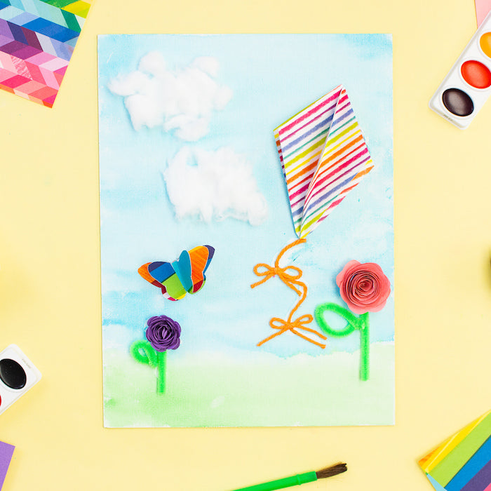 Get ready to soar up in the clouds and fly a kite as an artist! Grab your favorite colors of paper and let’s get started! Here’s what you’ll need to make this craft:
