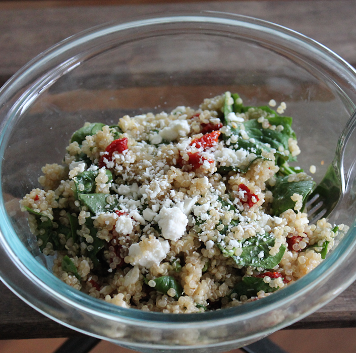 2. In a large bowl, mix quinoa, chopped spinach, sun dried tomatoes, feta cheese, balsamic vinaigrette, salt, and pepper.
