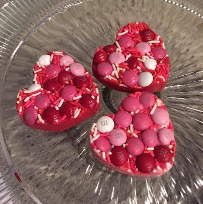 Follow the directions on the back of the candy/chocolate bag to melt the chocolate into a liquid. While that is melting in the microwave, layer the heart molds with M&M's and sprinkles.