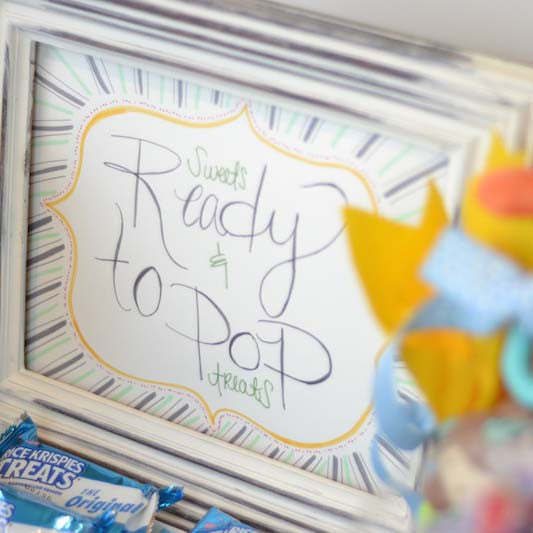 Showers do not require a full on catered meal. Your guests will be happy with sweets and treats that are simple. Pick a theme for your shower or the table. For the baby shower below I picked "Ready to Pop" and themed all the foods with thing's that pop. Sweets and treats include: popcorn, milk dud filled confetti poppers, rice krispie treats, bubble gum, pop tarts, blow pops and ring pops.