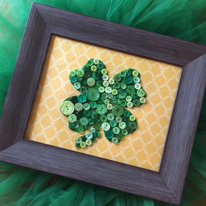 Button Art is an easy and fun DIY project to add festive decor to your St. Patrick's Day party! All you need are buttons, scrapbook paper, a shamrock cutout, a glue stick, a hot glue gun and a frame (without glass). Use your imagination to get creative with your designs!