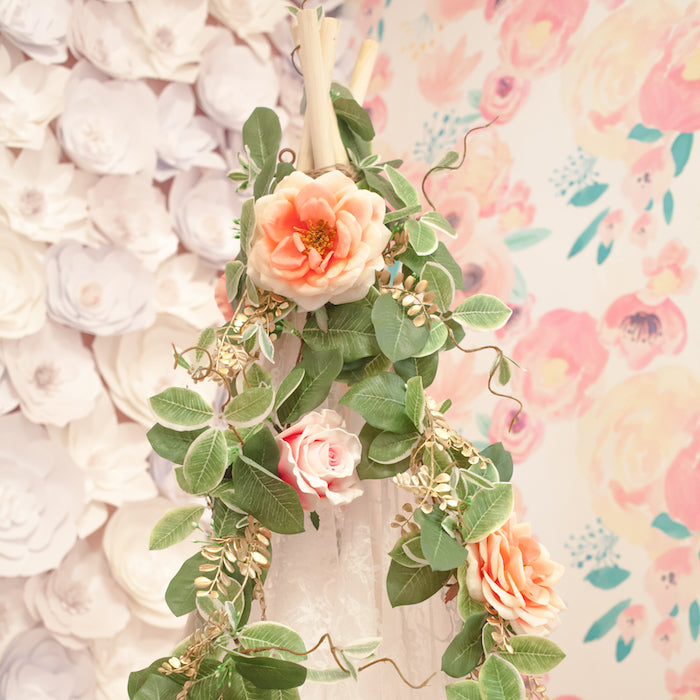 Lace Teepee: This teepee was also part of my original vision and I nailed the look I was going for. All you need for this Teepee is 1" dowels (they come in varying heights at the hardware store), Twine, lace fabric, floral garland (I build my own with ivy and faux luxe flowers from Michaels). Use the twine to tie the 4 dowels together so they form a square when spread out. Wrap as many times a necessary to create a snug fitting. Use hot glue to drape each side of the teepee with lace. Attach garland with floral wire! This truly is a 30 minute DIY that will provide hours of fun and hundreds of perfect photo moments!
