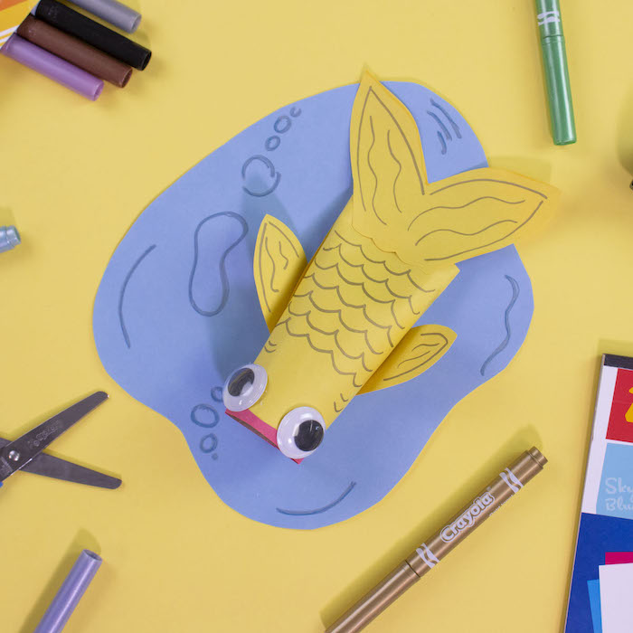 12. Glue googley eyes and stick on the top open end of the fish. Press down so they stick.