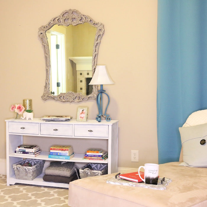 In addition to these pieces I styled my reading nook with a chaise lounge (this was the first piece of furniture I bought for my first apartment 10 years ago), carpet (hand me down from my parents), a mirror (hand me down from one of my Dad's clients), a pillow, blankets, tray and of course my favorite books and magazines! I love that this is now a relaxation zone for me as well as a perfect place to read my baby girl her favorite books!