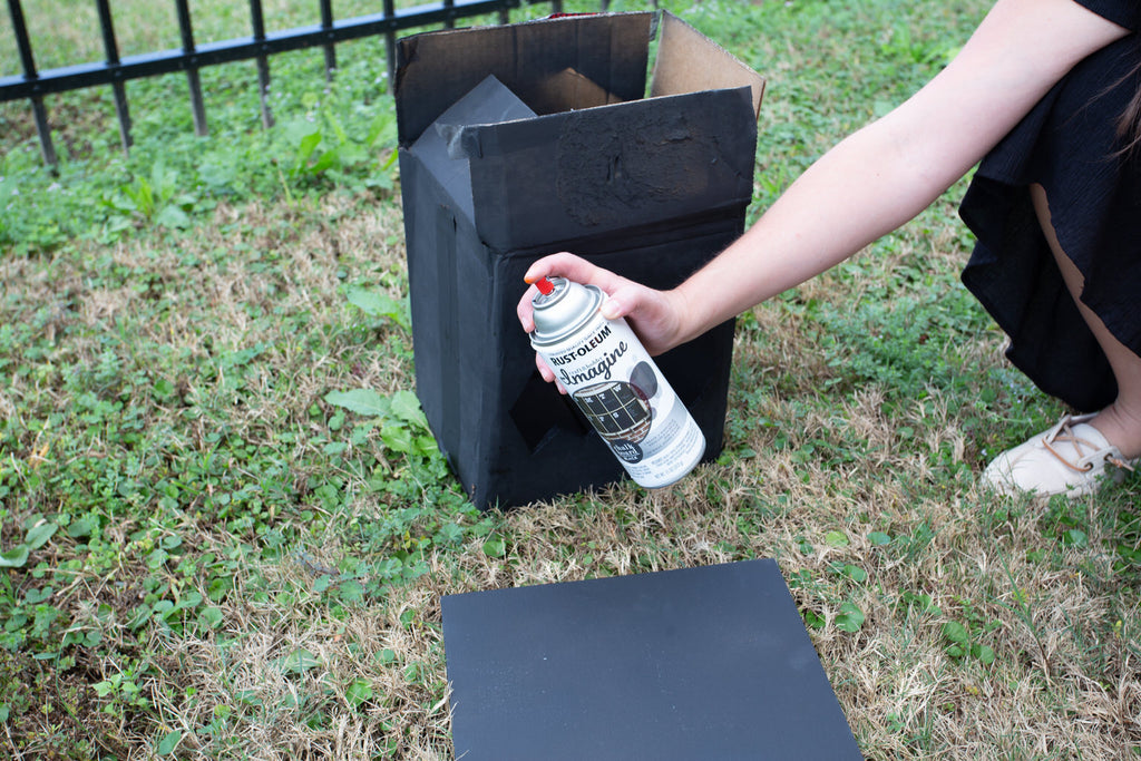 - Take the boxes and the canvas panel outside to spray paint. Before getting started make sure to read the safety instructions and shake the cans really well.