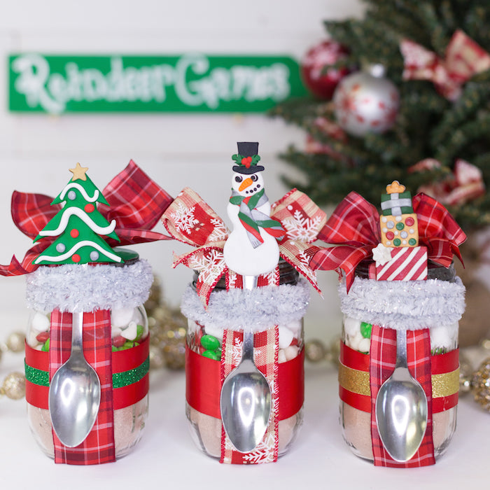 Hot chocolate in a jar is one of my favorite gifts to give this year I wanted to step up the creativity! I added a festive topper to the spoons using Sculpey III for the perfect gift! Watch below to learn how to make the Christmas tree topper and keep scrolling for the step by step photos to make the present stack and the snowman.