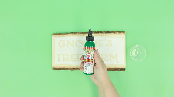 - To create the sign: use a stencil to paint words onto the raw wood plank. Adhere the stencil to the sign. Paint lettering with Unicorn SPiT in Dragon’s Belly and let dry.