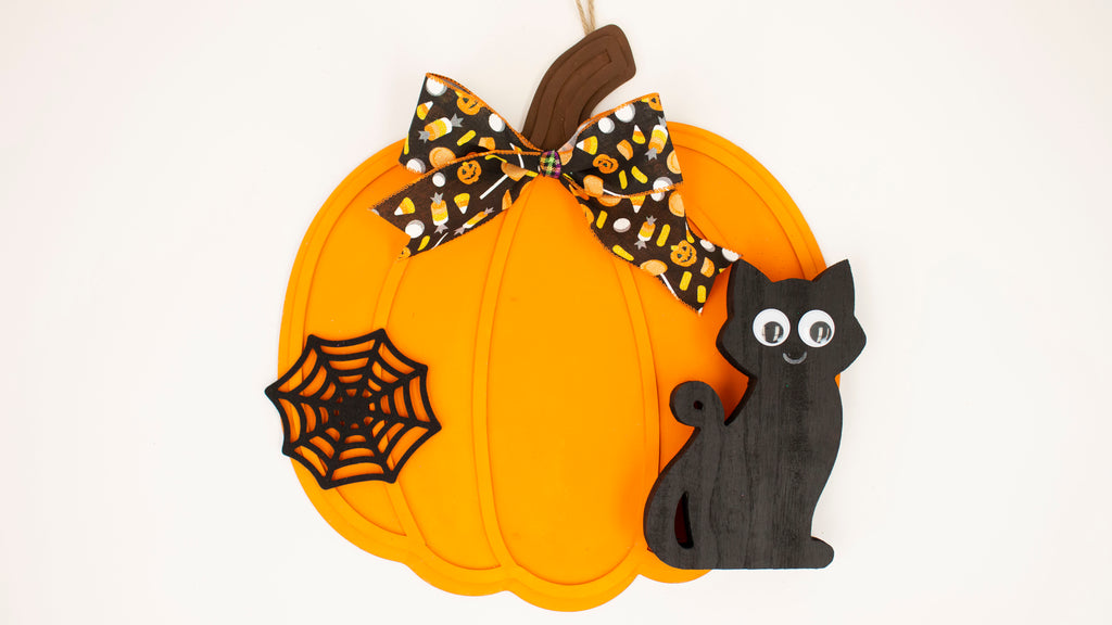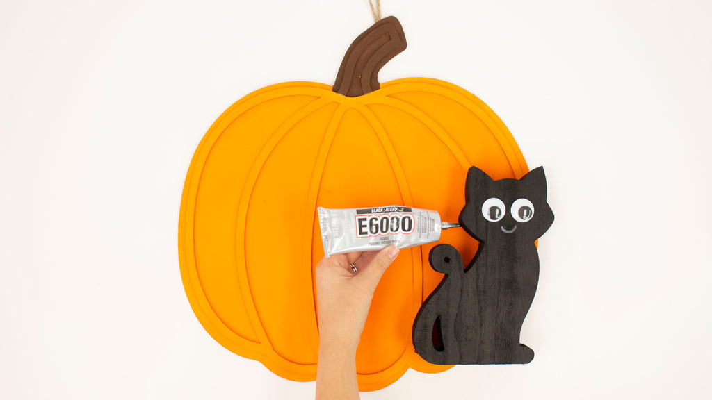 - Using your E6000 Black, glue the cat to the wood pumpkin.