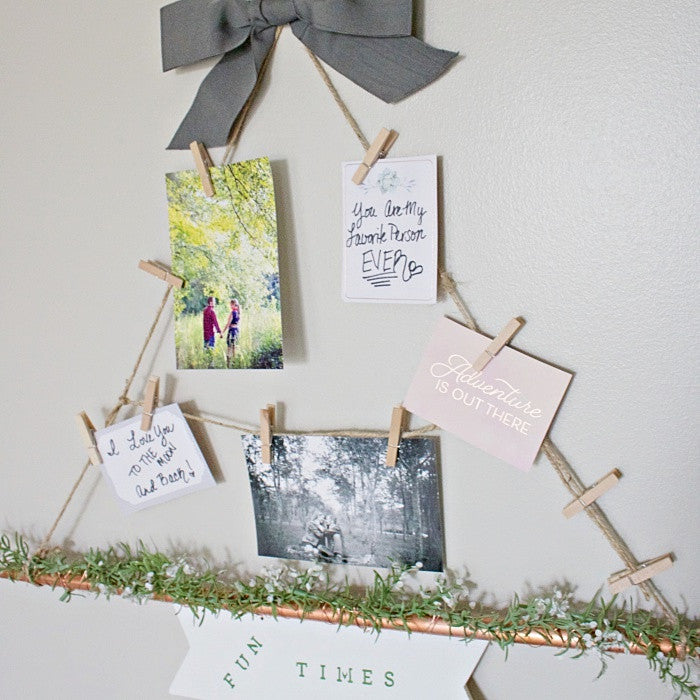 Step 7: Finally, attach the twine to each end of the pipe giving ample slack to hang. Attach pictures and/or notes with wooden clips and enjoy!