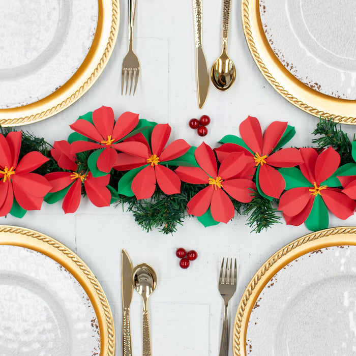 I love flower centerpieces for the holidays and thought it would be fun to create a table runner with paper flower poinsettias! Whip up this pretty table runner with the template we created (hand cut or use a cutting machine) and Beacon Adhesives!