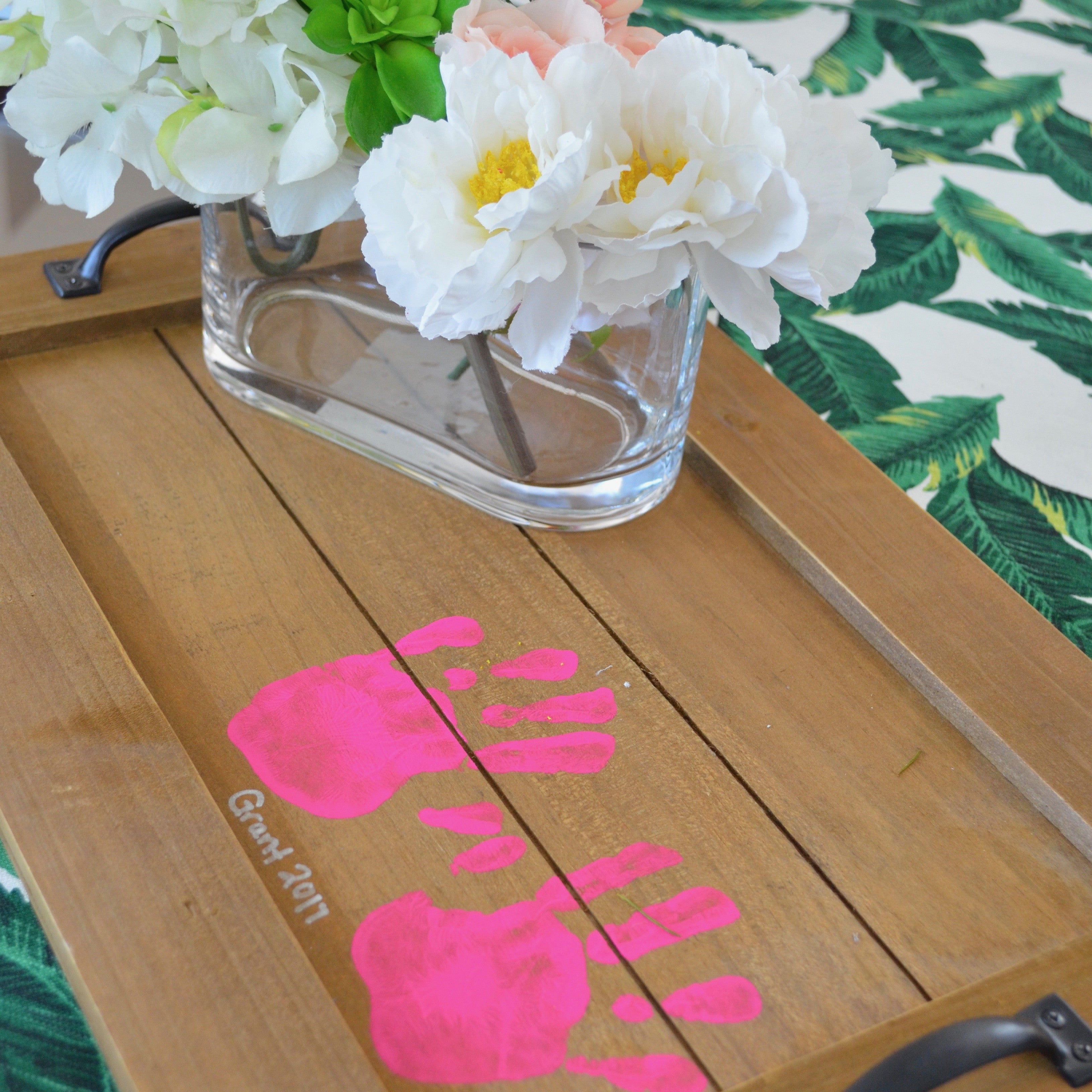 The other idea for a tray is one that is more simple. I found a plain wood tray that I love, and simply had my son do his hand prints on it. Then, I used a paint pen to write his name and the year. This is a great idea for a tray that you can use all year long, because it doesn’t say “Mother’s Day” on it, but it isn’t as sentimental as the picture tray. I thought it looked really pretty and chic though.