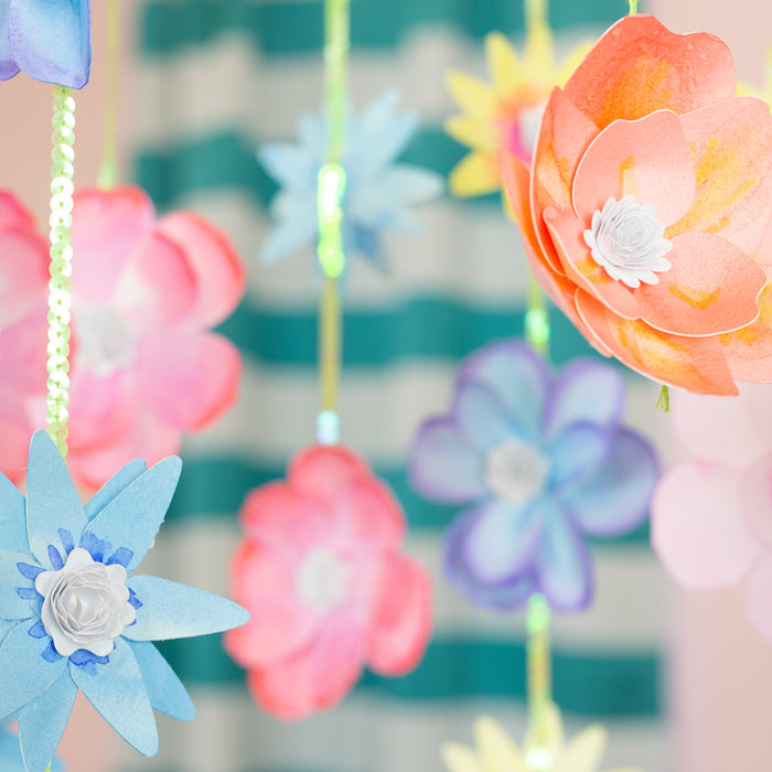 Watercolor is one of my passions and this mobile is so dreamy! This works in a nursery, at a shower, for a garden party or as spring decor for your home! We used Marabu Creative USA Graphix Aqua Inks and Pens to create these beautiful flowers! We made it even easier by providing the free downloadable templates for the flowers! I listed all the supplies below the video along with a few close up photos!