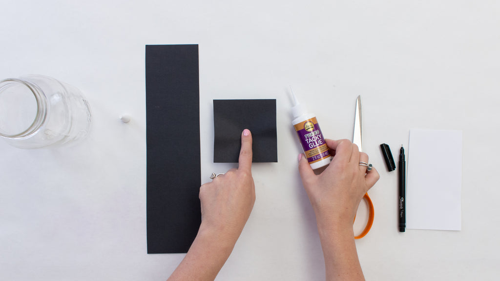 - Next cut a 3.5"x 3.5" square from the black paper. Glue to the top of the jar lid. You might need to adjust based on the size of your jar.