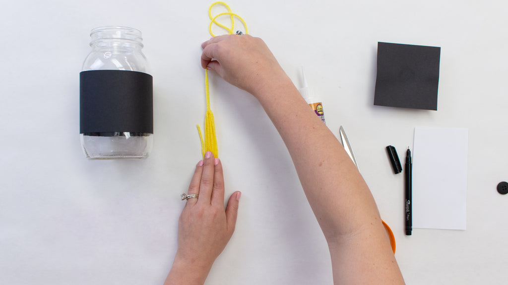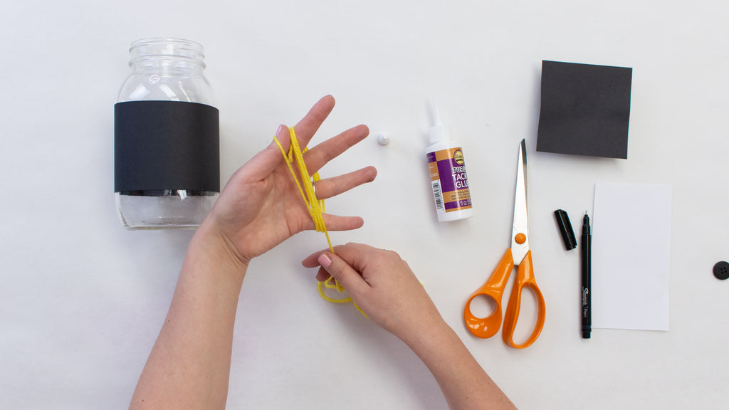 - Place a dot of glue on the back of the yarn and glue to the front of the jar. Hold in place until dry. It gets tacky super quick!