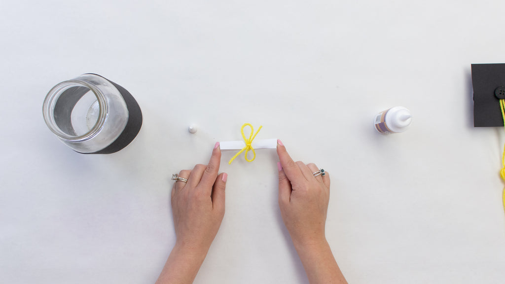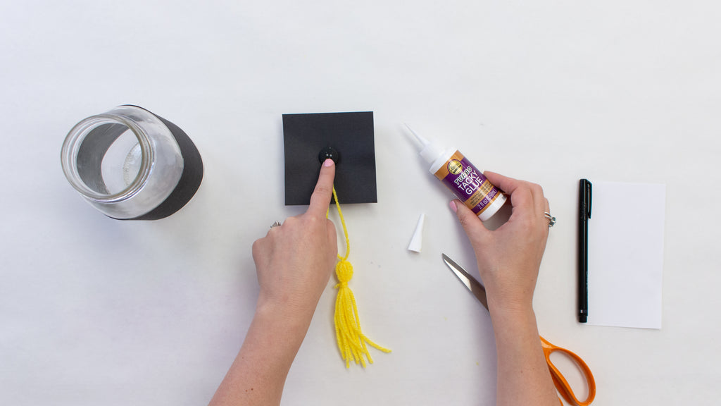 - Glue the ends of the tassel to the top of the graduation hat (jar lid). Place another dot of glue on top of the jar ends and adhere a button.