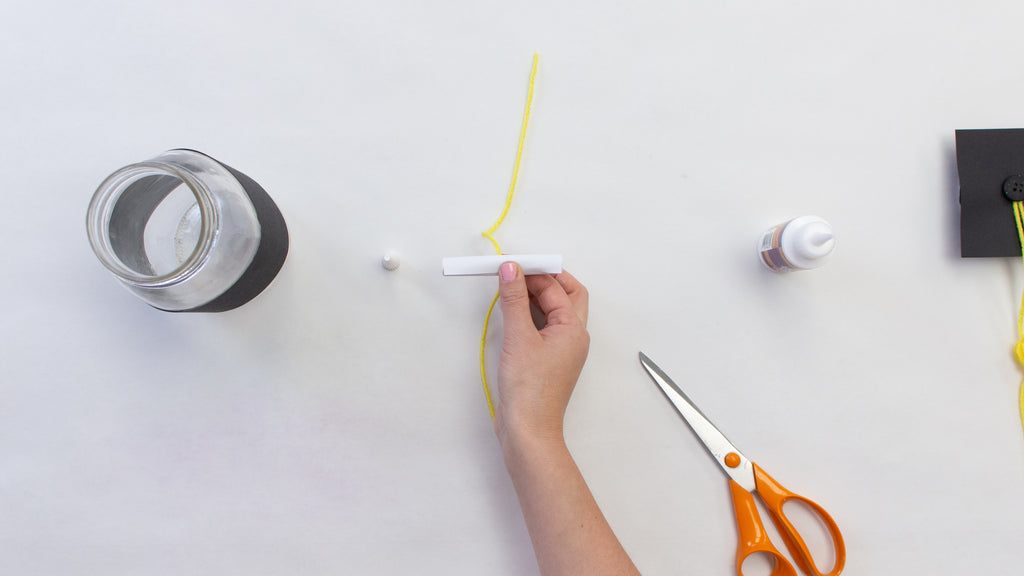 - Create a graduation tassel with the yellow yarn by wrapping it around your hand about 8-10x. Use a piece of string to loop through the top of the loops and tie a not.