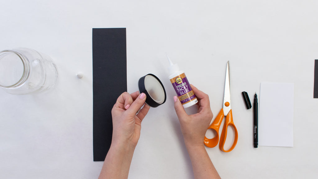 - Remove the lid from the jar. Cut a piece of black paper to fit around the rim of the lid. Use the Aleene's Turbo Tacky Glue to adhere the paper around the lid.