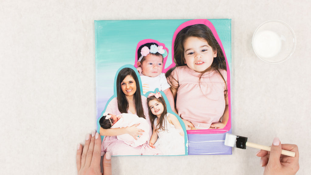 - Paint decoupage over the entire canvas, including the photos and cardstock paper to seal the photos.