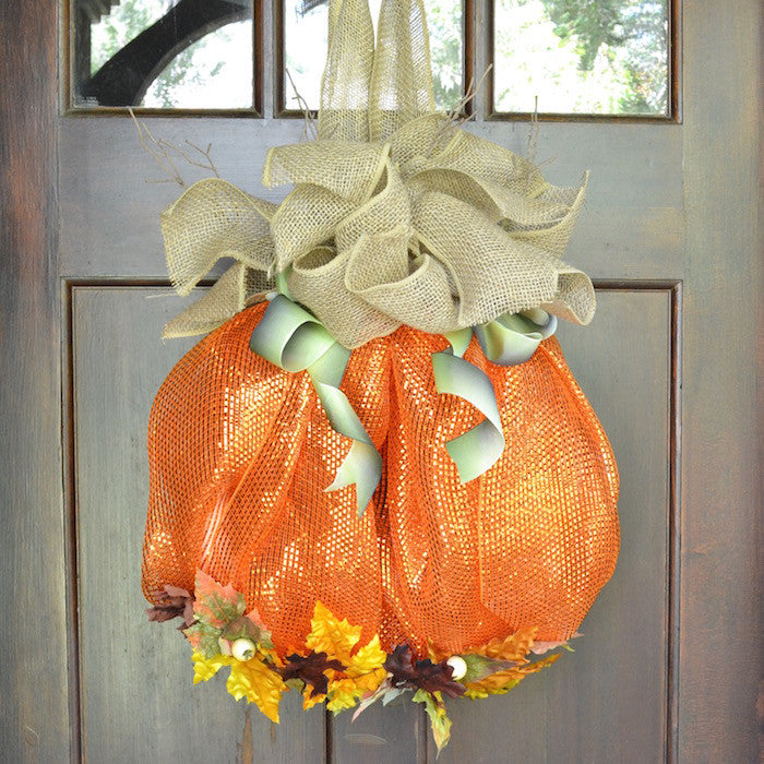 - Create a bow with the green ribbon and attach it to wreath form using 2 t-pins at the top of the pumpkin.
