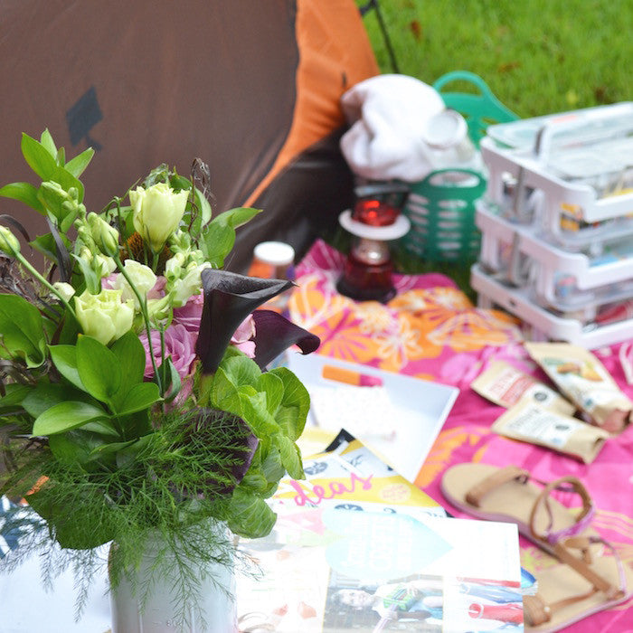 Bring a few fun and simple decorations to make the campsite feel like home. A few simple ideas include a fabric colorful banner, flowers in a plastic mason jar vase, table cover, throw pillows and a colorful blanket. I like to create a lounge area that can function as place to hang out and a place to dine. For dinner I cover the cooler with a with a table cover and decorate with flowers.