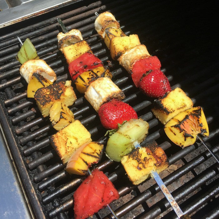 This take on shortcake or trifle is the perfect way to serve up all the amazing fruits that are in season. Fruits placed on the grill get a smoky caramelized flavor that matches the toasty gooey marshmallows. You can use your imagination to decide which to grill. We think this is going to be your new go-to dessert; impressive for guests and easy for you.