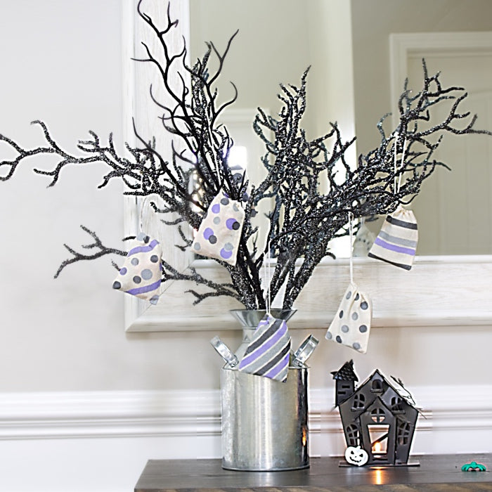 STEP 4: Now that you have all your treat bags decorated, fill them with goodies, and hang them in a creepy tree arrangement for your guests to enjoy!
