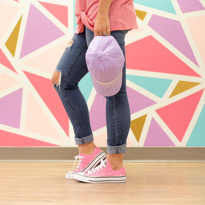 For these projects, I selected a pastel purple baseball cap and pink sneakers. You can pick any color or style that works for you! In the video, you will see how to create the "pack and fade" method, otherwise known as the "waterfall" motif. Stones are tightly packed together as with the interlocking technique but then you begin to gradually space them farther and farther apart so they appear to gradually fade away. Below the video, I included step by step instructions for the sneakers.
