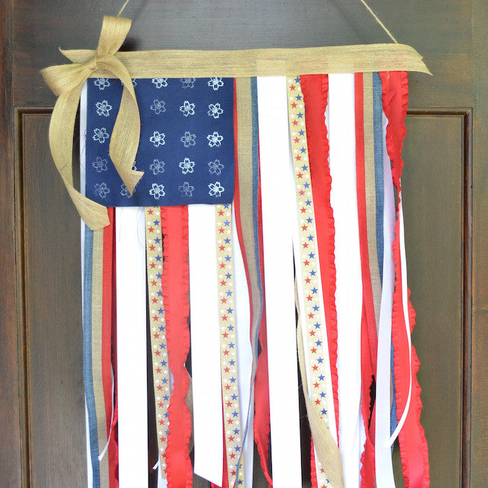 - Optional: Tie a bow with the burlap/jute ribbon and attach to the top left corner of the flag with hot glue.