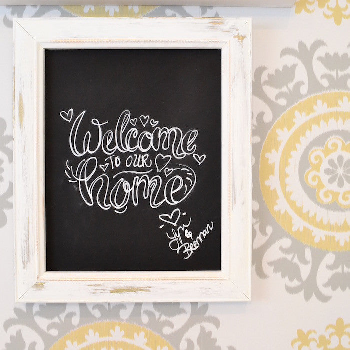 Using Waverly White Chalk Paint, paint the frame. While it is still wet use a baby white to light remove paint in the areas you want to look distressed. Let the first coat dry and repeat with a second coat and the paint removal process with a baby wipe.