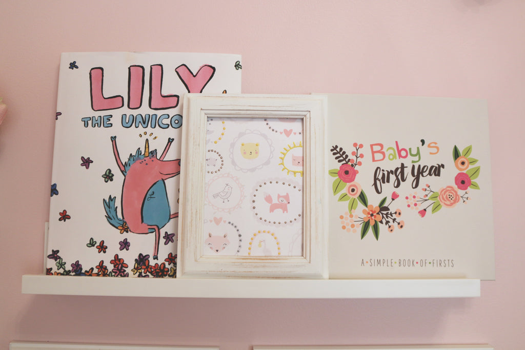 I also love Nuvo's Crystal Drops (used around the hearts above) for adding simple embellishments. I took a baby themed piece of decorative paper, added embellishments with the Crystal Drops and put in a frame to create artwork for Lily's nursery!