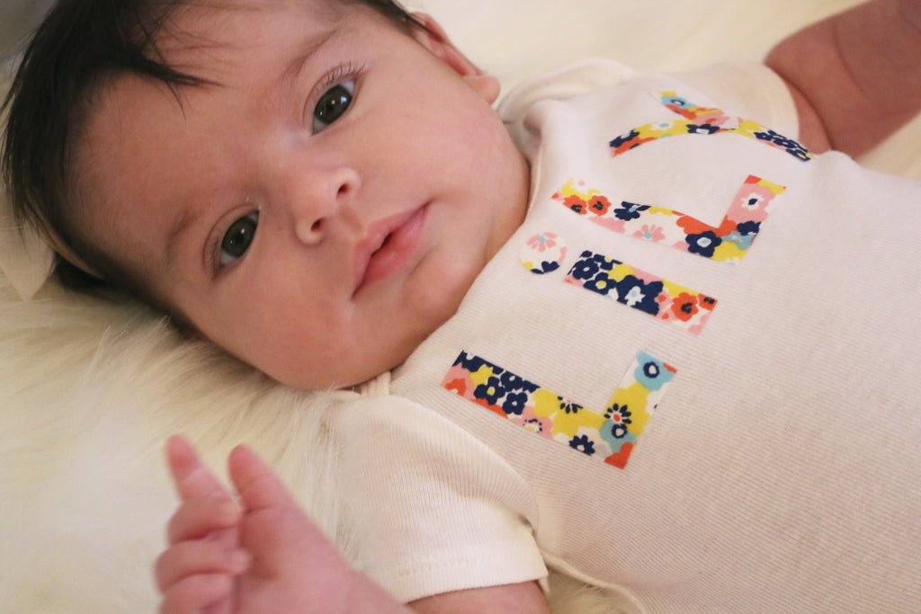 The tape is fabric with a sticky backing so you can use it on paper/cardboard and position it on fabric and simply iron-on for 25-30 seconds on medium heat. I took some rolls home and made this personalized onesie for Lily! I am so OBSESSED!!!!