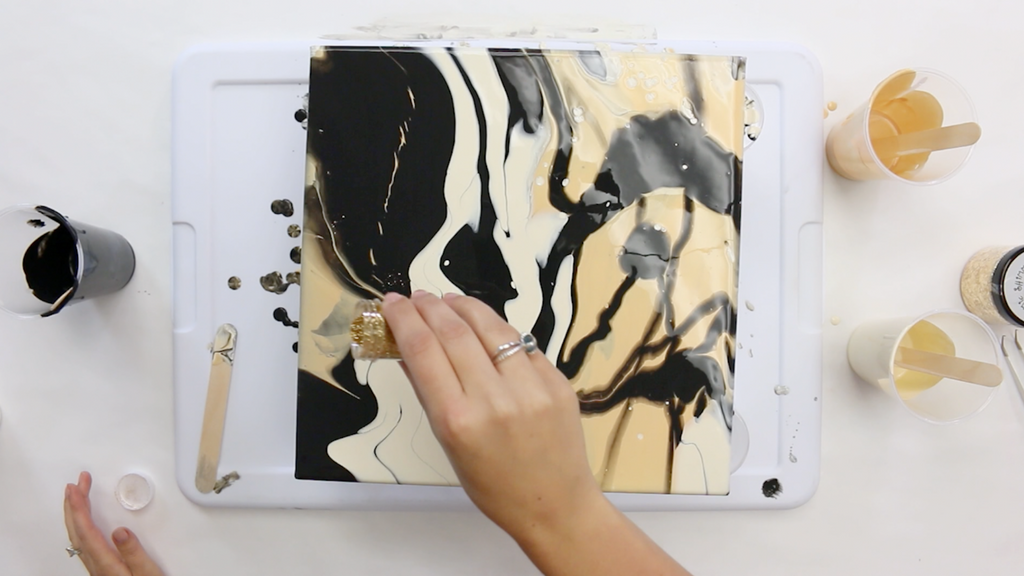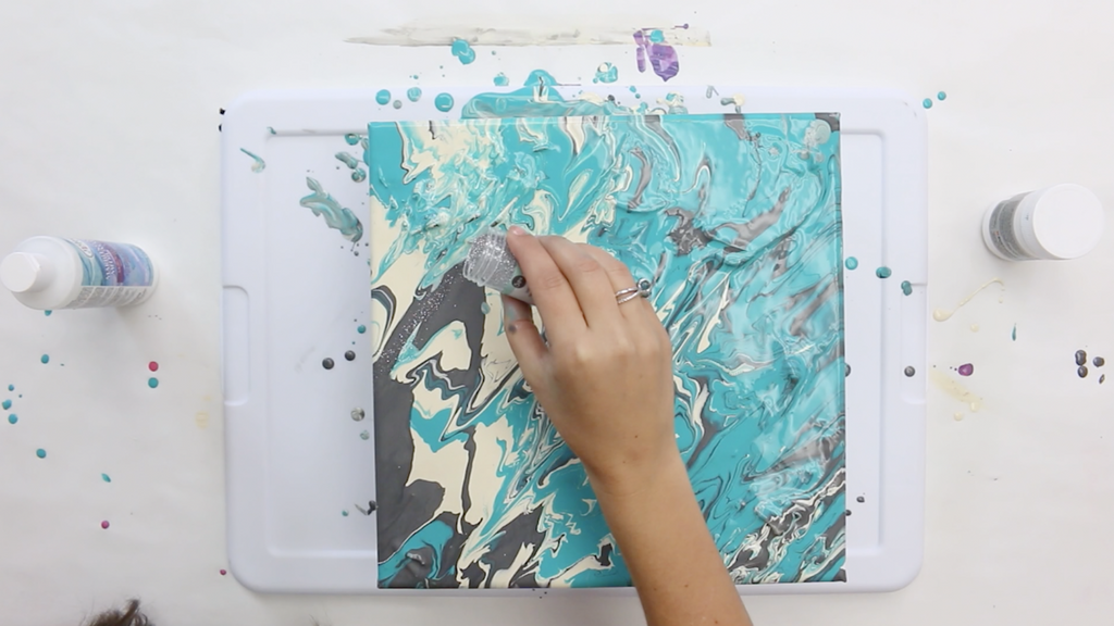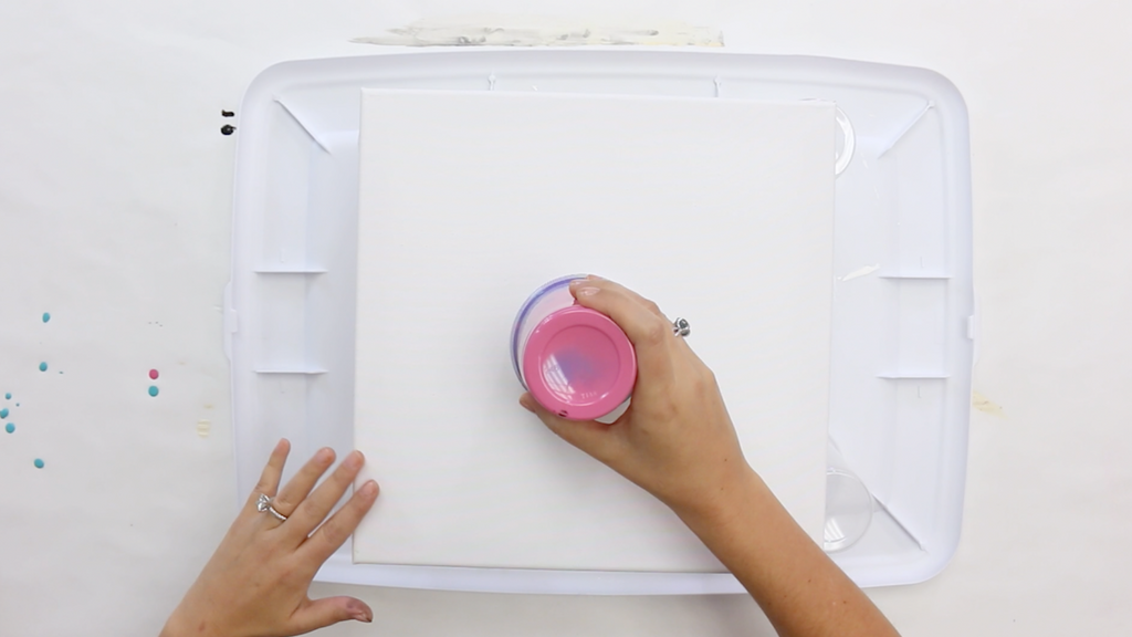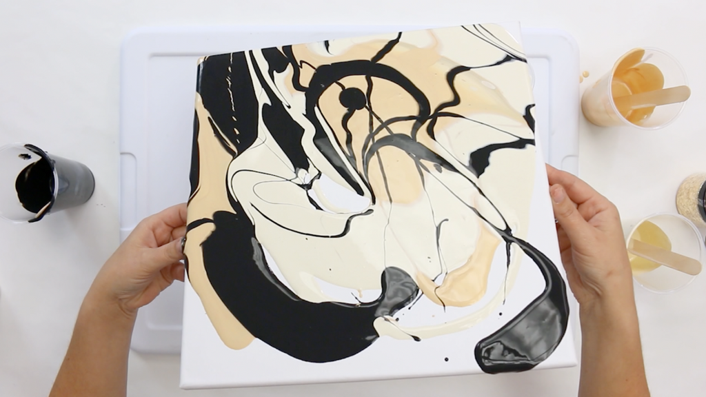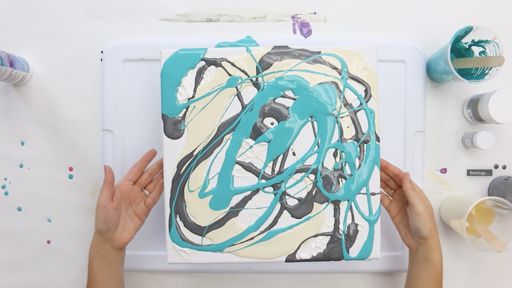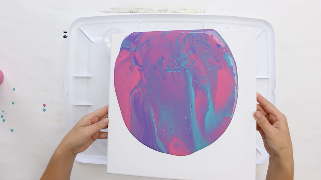 - Once you have poured the majority of the paint place your hands under the canvas and slightly tilt each direction to move the paint.
