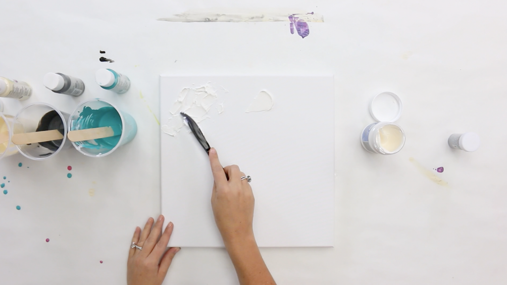 - Use the plastic knife to spread randomly on the canvas. Dab the knife to add texture and peaks.