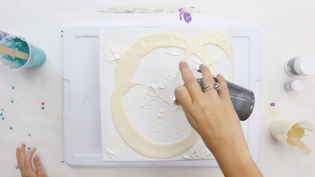 - Alternating colors pour and swirl the colors around the canvas until all the paint is on the canvas.