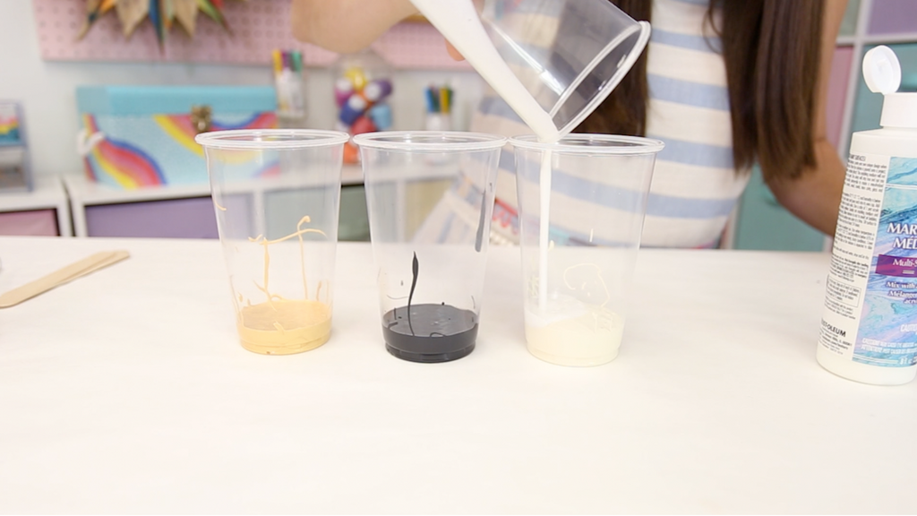 - Mix a 1:1 ratio of Marbling Medium with each color of acrylic paint in a separate plastic cup.