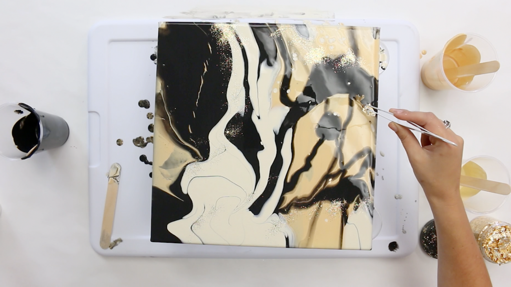 - Using the tweezers add gold flakes around the canvas. Carefully drop them on the wet paint. Don't touch the tweezers to the paint.
