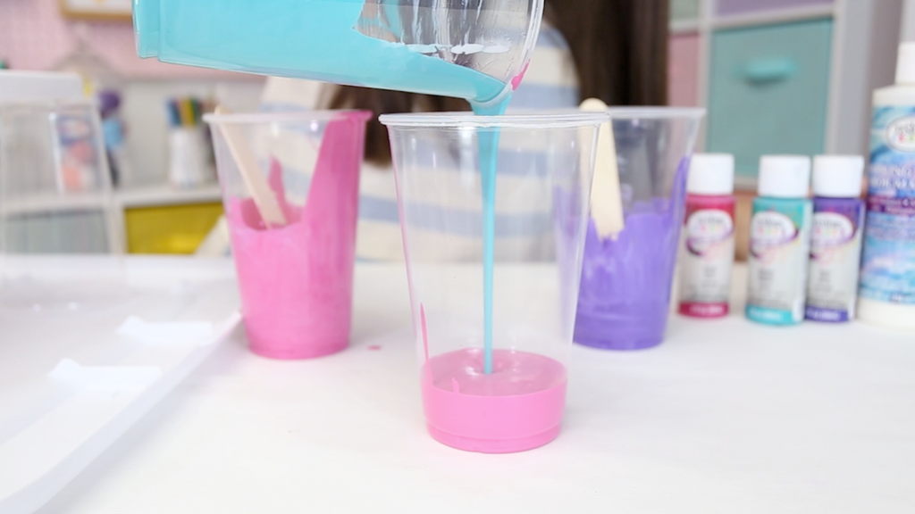 - In an empty cup alternate pouring each color mixture until all the paint is in the one cup.