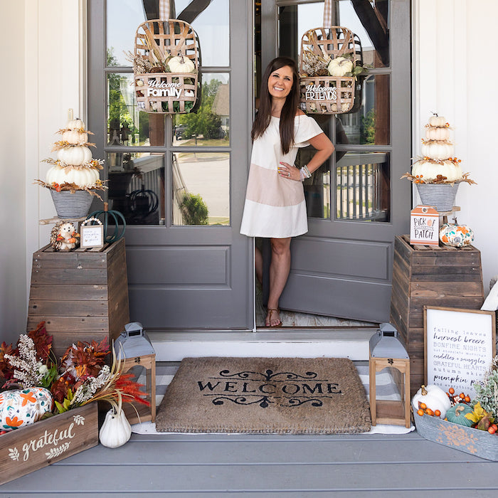 Welcome Fall!! It might not feel like fall but I am ready to welcome the crisp air and pumpkin vibes! I am so excited to reveal my fall front porch and share a series DIY projects that I created with Eclectic Products to celebrate our first Fall in our forever farmhouse.