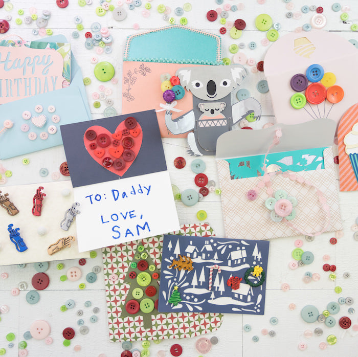 A card is a perfect way to make someone smile. Whether it is a special occasion or just a way to say I love you it is so easy to add extra embellishments to handmade or store bought cards. We created 6 cards that are perfect for birthday, everyday love, kids birthday, Mother's Day, Father's Day and Christmas. Check out the video to get inspired and to make it easy our friends at Buttons Galore & More created a super bundle of buttons and embellishments to help you easily embellish cards all year round! The bundle is 50% off! Even if you buy your cards from the store, pop a few embellishments on and it now has a special handmade touch!