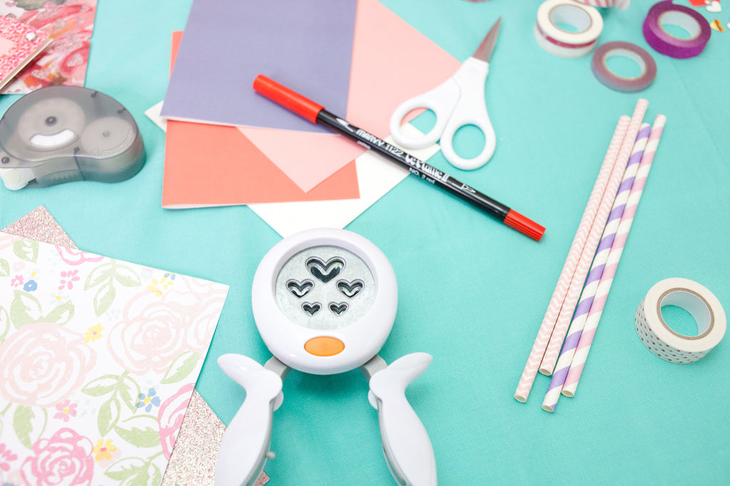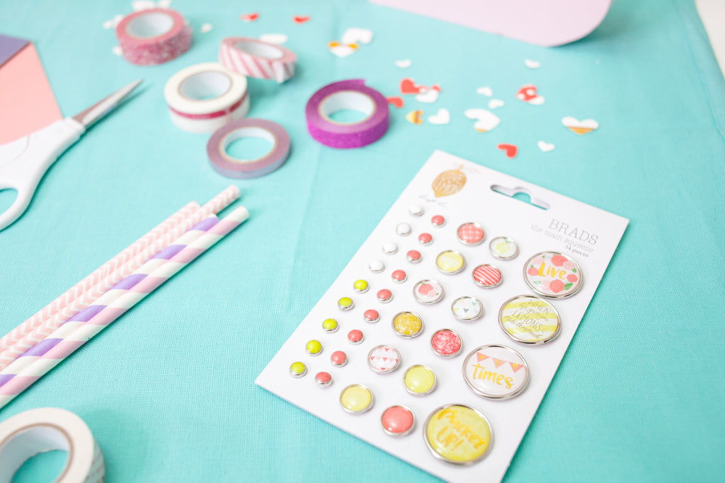 I created a fun do it yourself card station for everyone to create their own personalized greeting cards. Load up your bar with decorative paper, washi tape, brads, paper straws, gems and tools like the Fiskars heart punch, scissors, and glue dots!