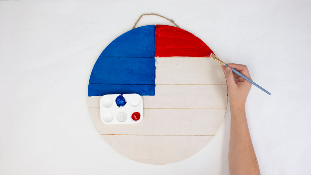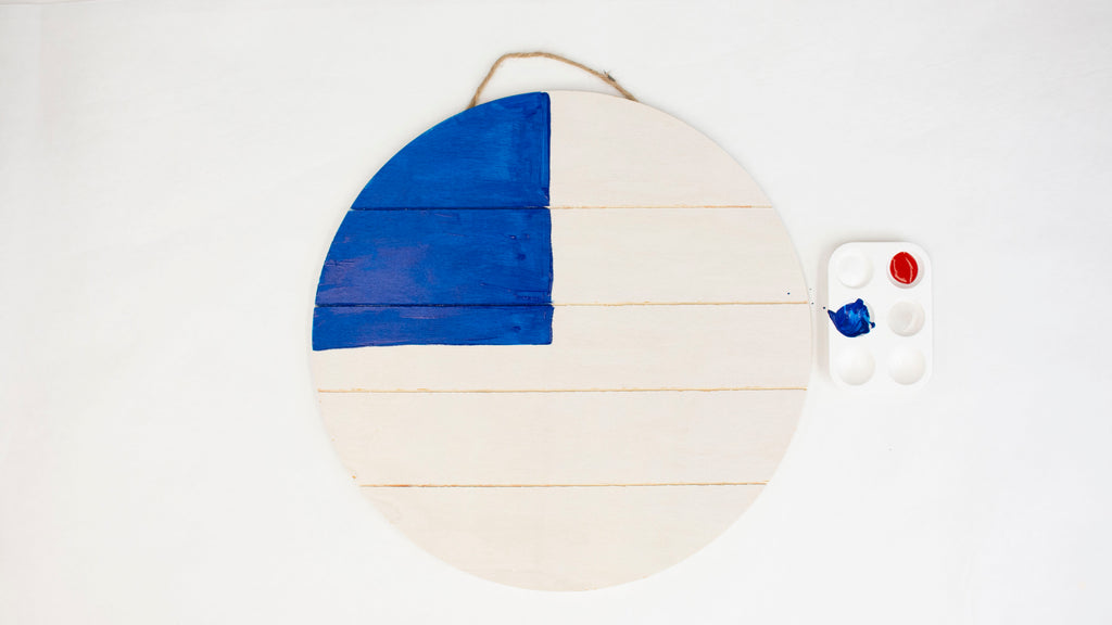 - Paint a flag pattern on the wood round by using the Unicorn SPiT Blue Thunder to create a partial rectangular in the top left section. Then paint Stripes using the Unicorn SPiT Molly Pepper and White Ning.