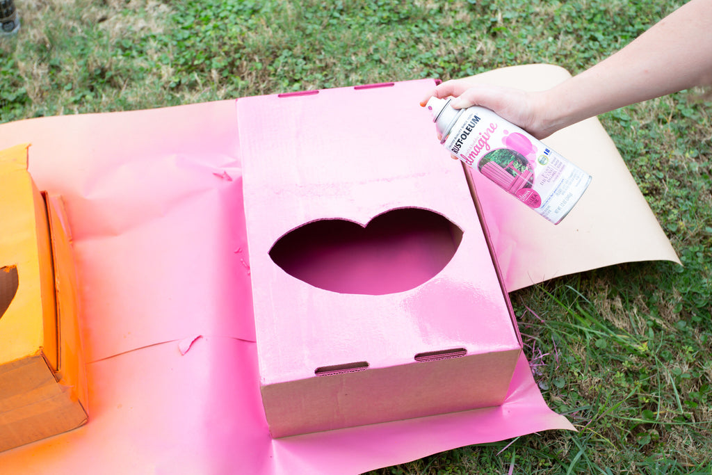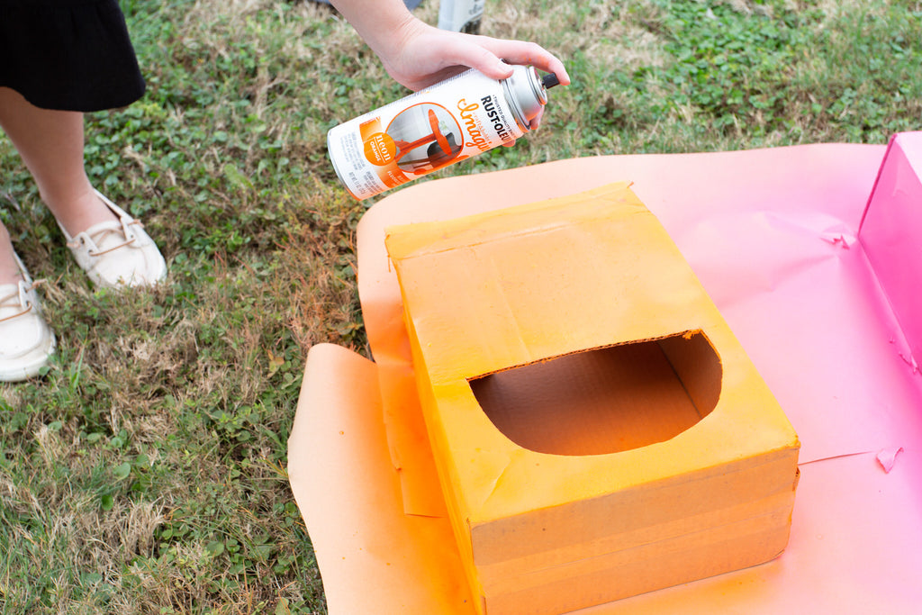 - Take the boxes and the canvas panel outside to spray paint. Before getting started make sure to read the safety instructions and shake the cans really well.