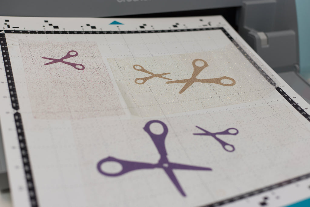 - For the scissors cut I left them as is and loaded my mat with multiple sections of color iron-on glitter. I scanned the mat so the different colors would populate on the screen.