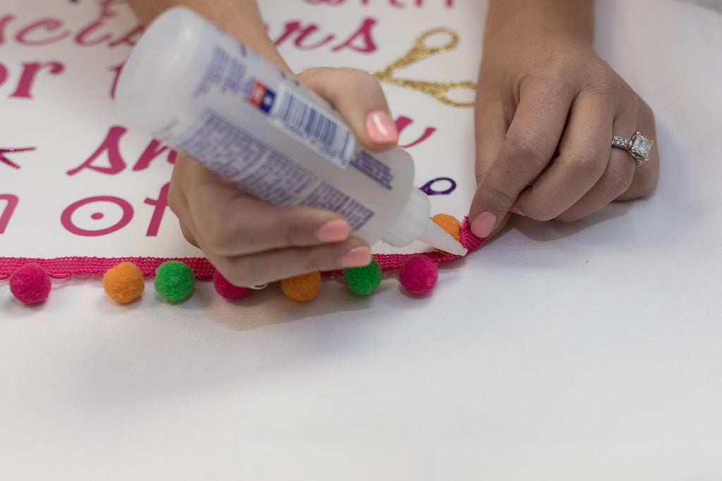 Hi Sarah – I recommend Beacon Fabri-Tac for adding the embellishment! It holds up and washes really well!