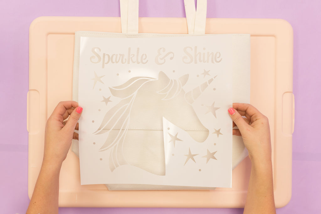 - Place stencil on tote bag. Tape off excess areas that you do not want to the paint to hit.