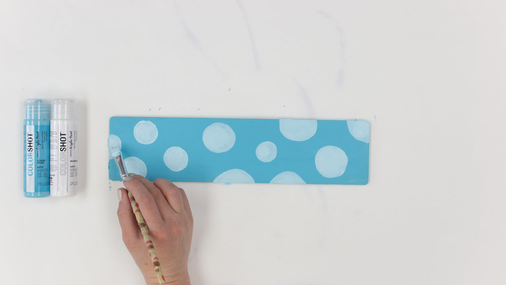 - Paint polka dots on the wood plaque with the lighter shade of blue. Set aside to dry.