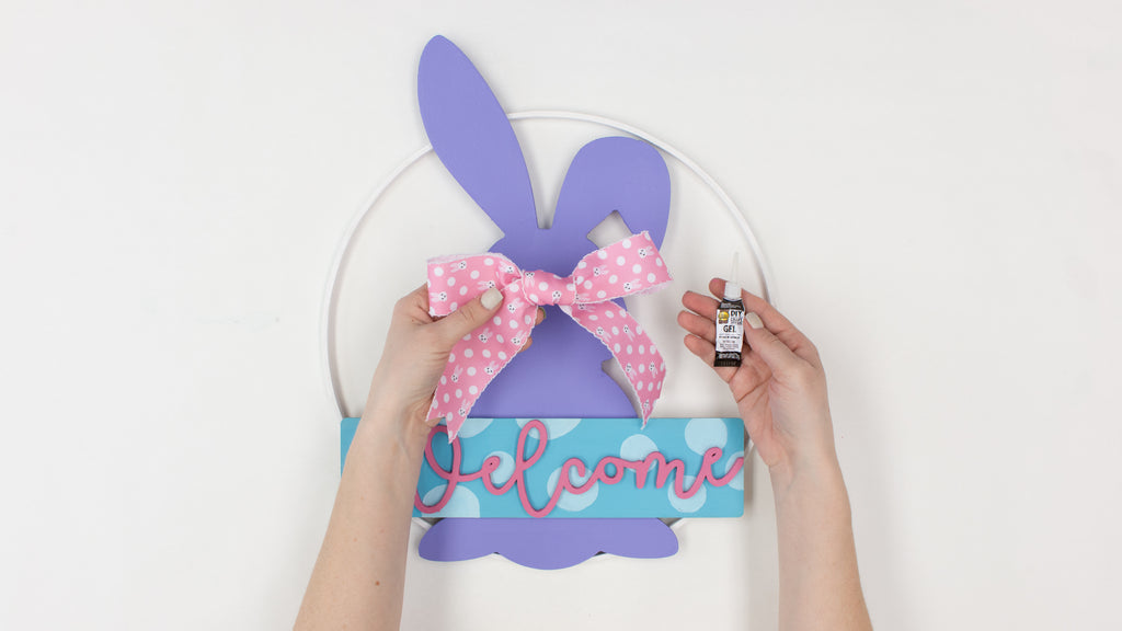 - After gluing all the wood pieces together, tie a bow with your ribbon and secure with glue to the bunny’s ears.