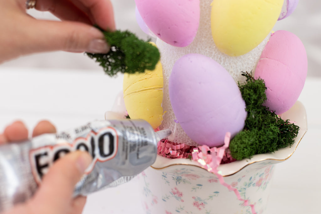 - Next fill in the spaces between the eggs by gluing reindeer moss to the cone. You want to fill in all the empty space so you do not see the cone anymore.